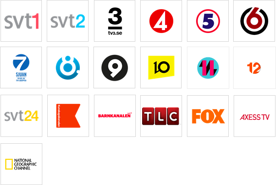 SVT1, SVT2, SVT24, TV4, TV6, Fox, Barnkanalen, Kunskapskanalen, Axess TV
